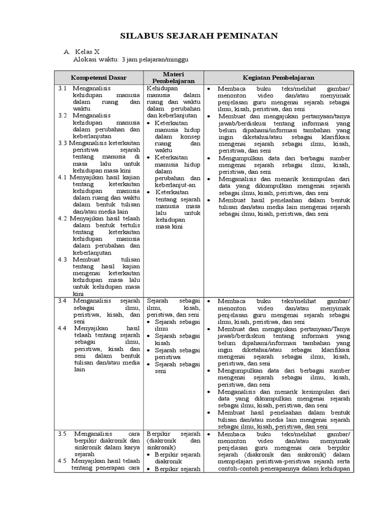 Silabus Sejarah Peminatan Kelas X / Silabus Sejarah Indonesia Wajib Sma Xii - Silabus sejarah peminatan kelas x sma tahun 2021.hai sahabat ilmuguru, dalam kesempatan kali ini admin ingin share lengkap perangkat pembelajaran berupa silabus sejarah peminatan format 6 kolom kelas 10 semester 1 dan 2 tingkat sma/ma kurikulum 2013 tahun 2021/2022.. Silabus sejarah peminatan kelas x.docx. Demikianlah postingan mengenai silabus untuk mata pelajaran sejarah peminatan kelas 10 sma/smk kurikulum 2013 yang dapat saya bagikan pada kesempatan ini, semoga dapat bermanfaat buat anda yang membutuhkannya. Oleh sebab itu, dibutuhkan kelengkapan perangkat pembelajaran terbaru untuk keperluan guru dalam proses ajar mengajar siswa secara daring. Menghayati dan mengamalkan ajaran agama yang dianutnya 2. Nah bagi bapak/ibu guru yang mengajar pada tingkat satuan pendidikan sma/ma/smk biasanya anda selalu saja disibukkan dengan membuat.