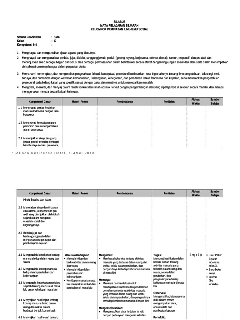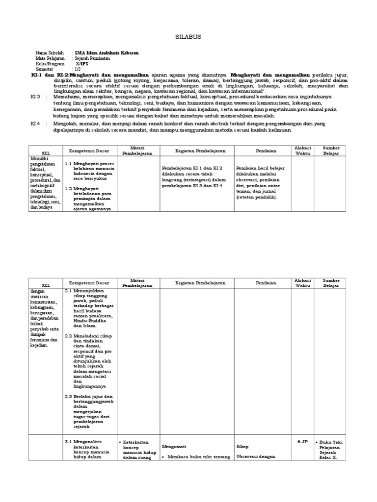 Silabus sejarah peminatan kelas x 1965 dan masa depan hukum indonesia belia masa depan bangsa dan negara sejarah perjuangan bangsa indonesia. Silabus sejarah peminatan kelas x.docx. Silabus pendidikan agama islam dan budi pekerti kelas 10, kelas 11 dan kelas 12,silabus matematika wajib kelas 10, kelas 11 dan kelas 12,silabus matematika peminatan kelas 10, kelas 11 dan kelas. Silabus k13 bimbingan dan konseling bk kelas 10 sma semester 1 dan 2 revisi 2020 kurikulum rencana pembelajaran pendidikan from id.pinterest.com. Dapatkan konten sejarah versi docx lain nya di www.popcorns.id Arsip blog 2018 (2) september (2) 2017 (1) januari (1) 2016 (67) september (3) agustus (3) maret (2) februari (59) karya tik kelas xii ipa. Hamid hasan (1988) mengemukakan bahwa konsep kurikulum dapat ditinjau dalam empat dimensi, yaitu: Menghayati dan mengamalkan ajaran agama yang dianutnya 2. Pembelajaran sejarah bukan hanya sekedar bercerita namun sebagai cerminan kehidupan agar peristiwa kelam tidak diulangi di masa depan sementara peristiwa baik agar menjadi tonggak pembangunan sebuah bangsa. Menghayati dan mengamalkan ajaran agama yang dianutnya 2. Silabus sejarah indonesia kelas xi kurikulum 2013 revisi 2017 … Silabus lengkap kurikulum 2013 untuk sma. Aktivitas individu, kelompok, atau masyarakat tersebut akan melahirkan peristiwa.